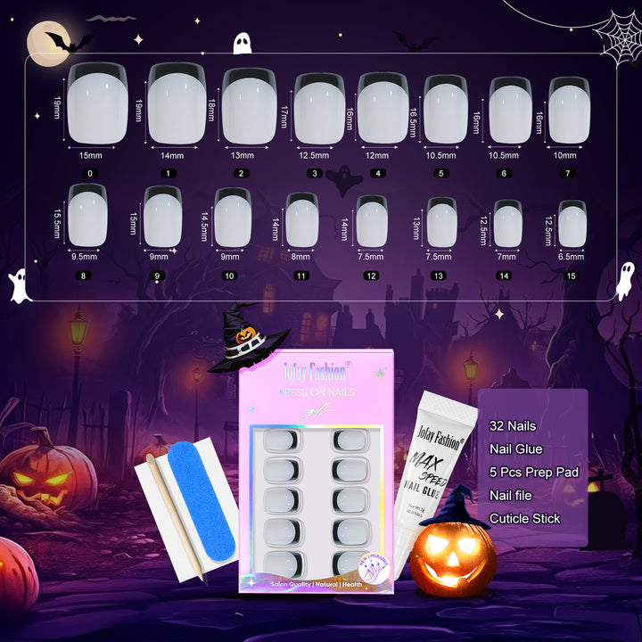 Gothic Square Black Halloween Press On Nails in 16 Sizes - 32 PCS Soft Gel Kit